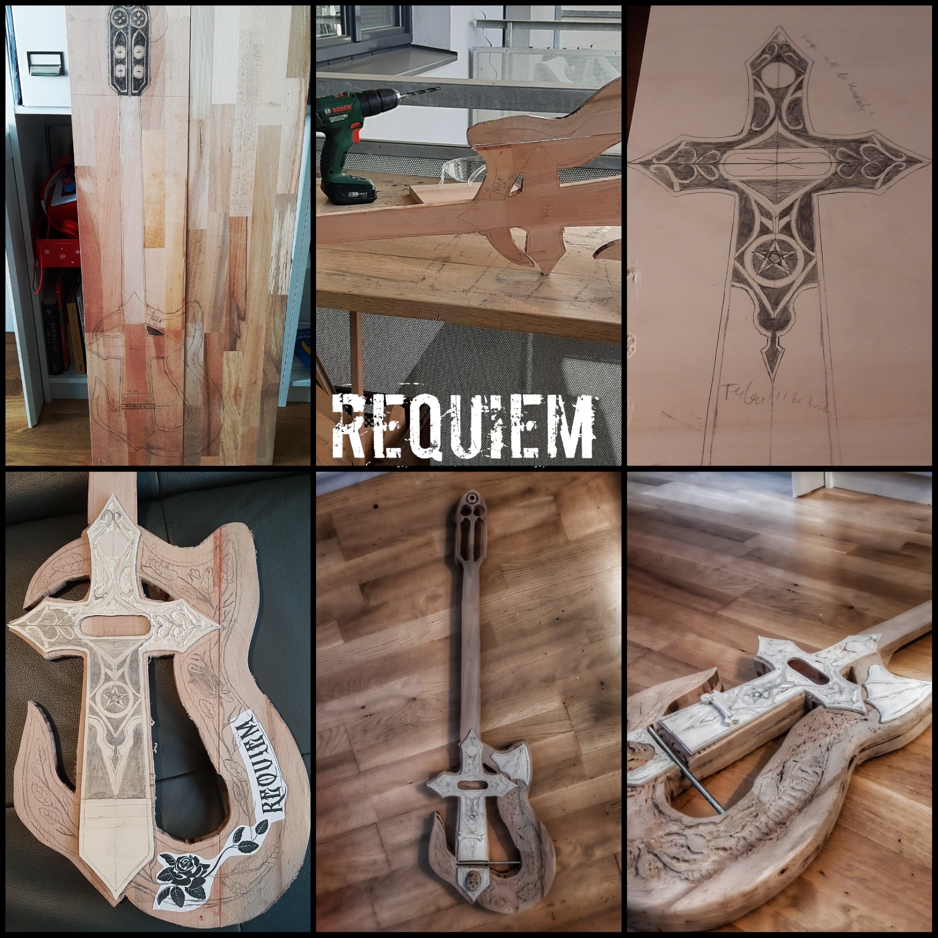 Ich bin erstaunt wie die Gitarre Stück für Stück entsteht. Gebeizt wurde mit Schwarz, Walnuss, Eiche hell, rot, grün und Mahagoni. Für den Schriftzug und die Konturen auf dem Kreuz habe ich einen Goldstift benutzt. In ein paar Tagen wird sie fertig sein.